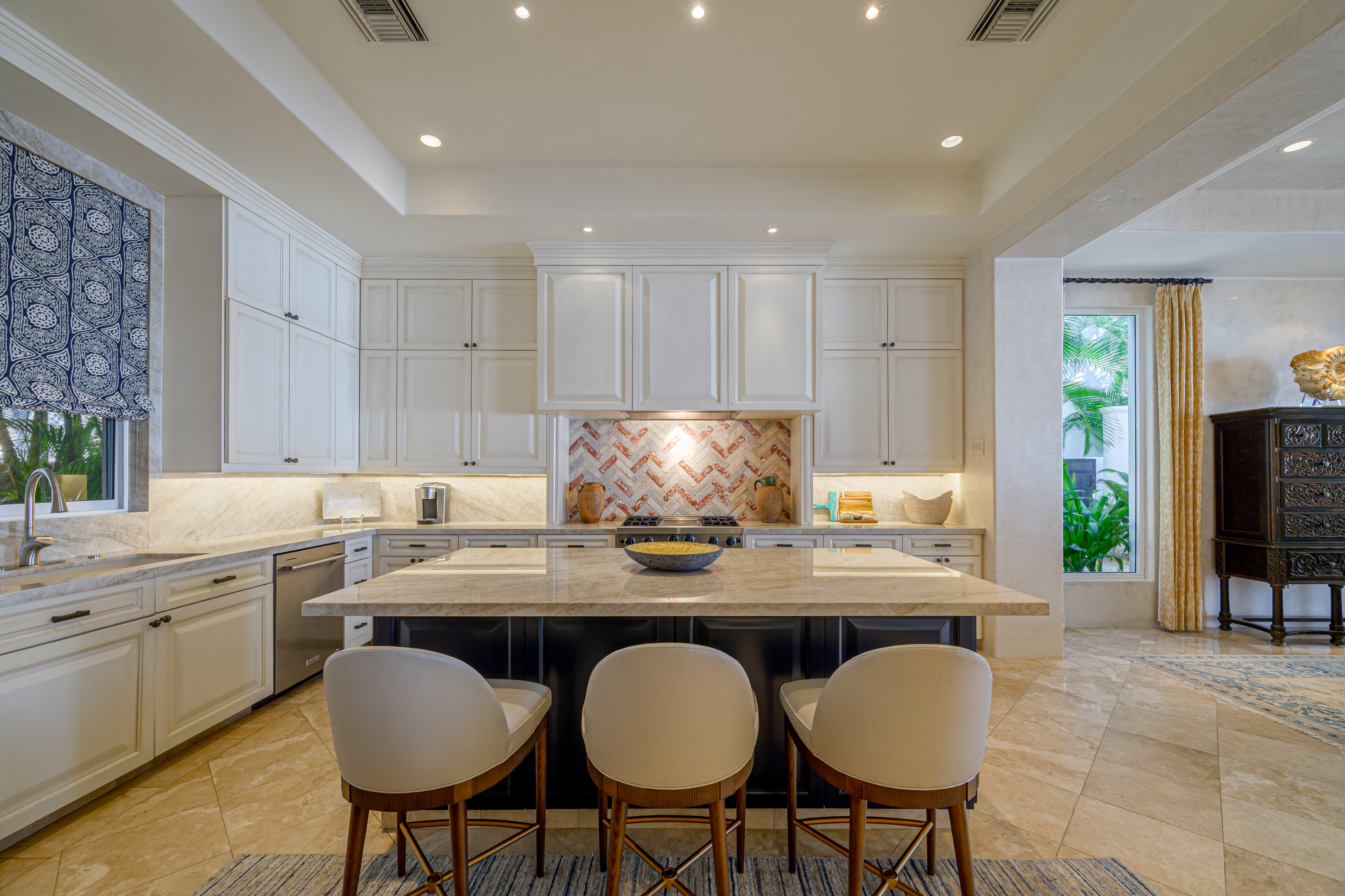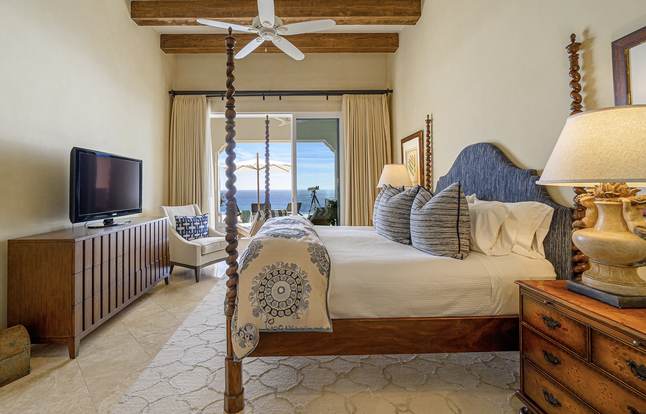 Inside, a soft neutral palette is layered with shades drawn from the surrounding sky and sea. Glazed tile bathrooms reflect a respect for Mexican architectural tradition, balancing beauty with everyday comfort. At night, the sound of rolling waves carries through the home, creating a setting made for rest and easy evenings.