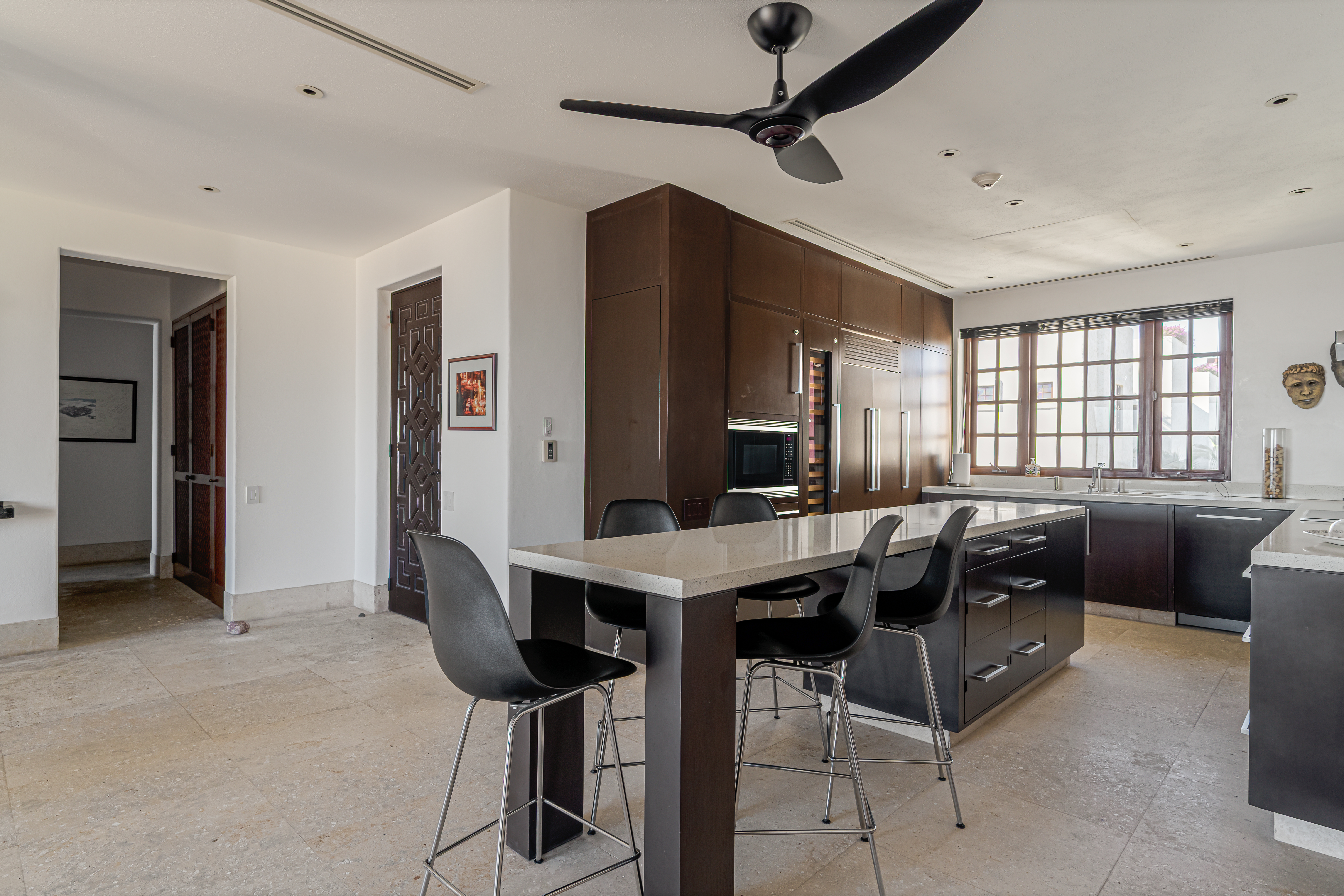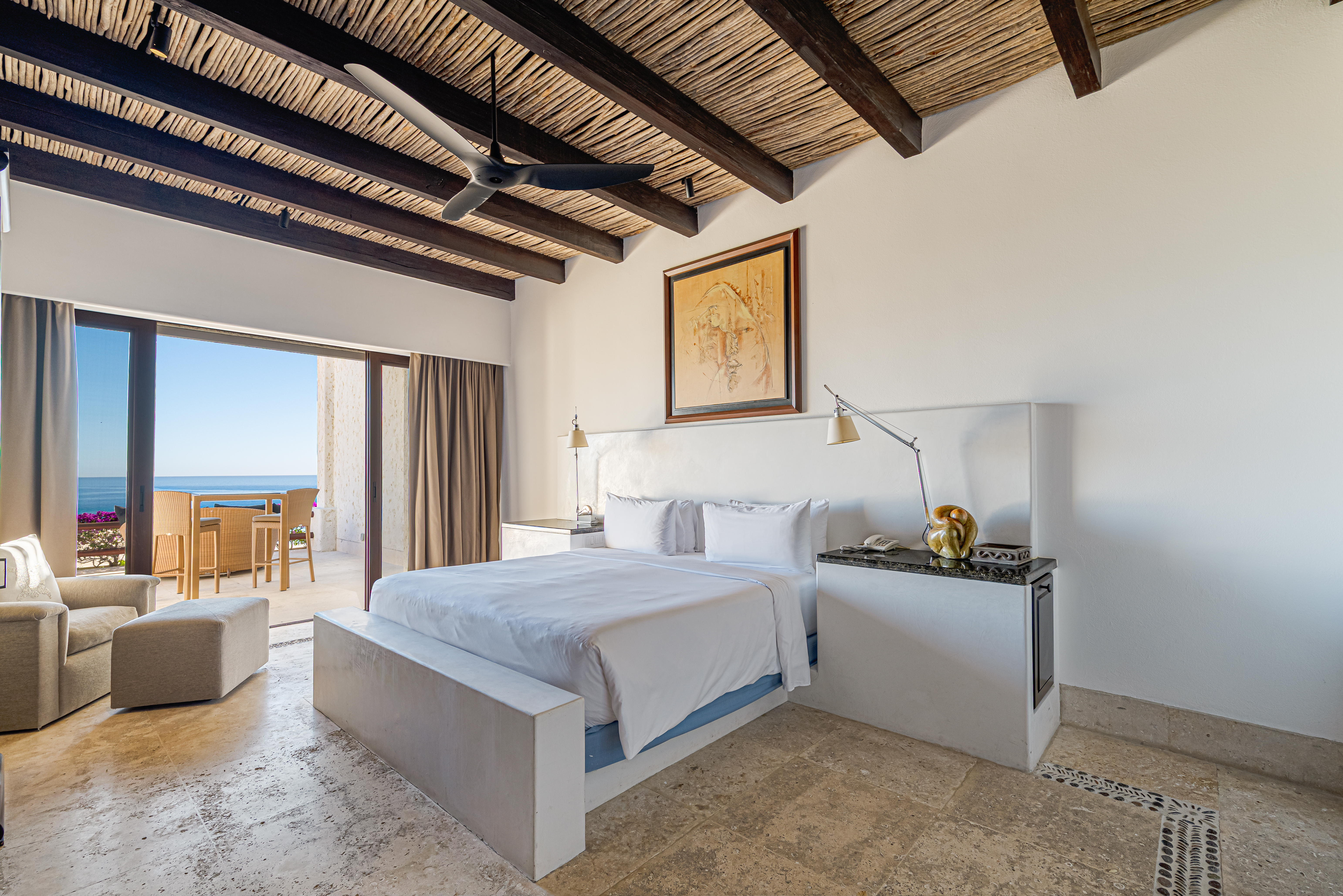 Designed for effortless indoor–outdoor living, the residence features three private terraces and a spacious rooftop deck, creating multiple settings for relaxation, entertaining, and quiet moments under the Baja sky. Inside, elegant marble flooring, soaring beamed ceilings, and a generous open living area flow seamlessly