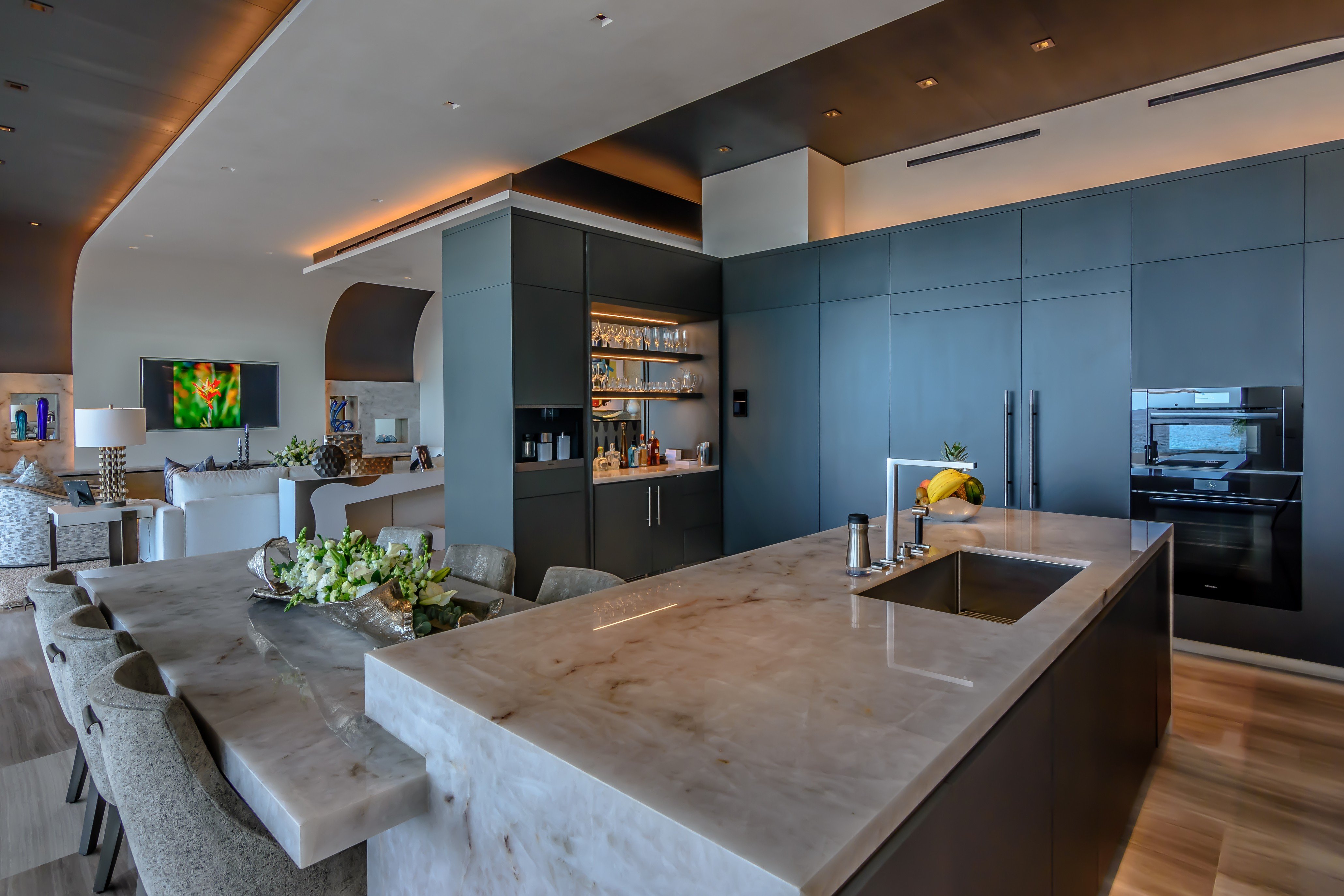 Inside, Villa 452 is an exquisite blend of modern design and classic craftsmanship, with refined furnishings, curated local artwork, and marble bathrooms. A sophisticated lighting design balances natural sunlight with ambient ceiling fixtures, enhancing the villa's warm and inviting atmosphere.