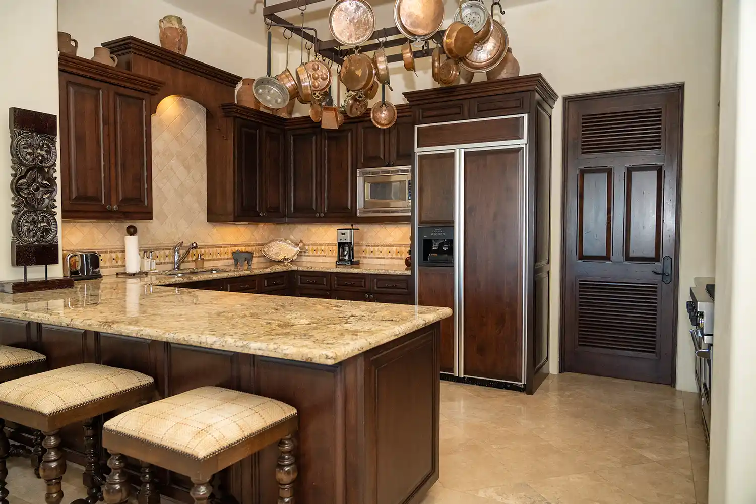 Rich chocolate woods carry throughout the indoor and outdoor living spaces, with beautiful beams, cabinetry, and patio spaces. The outdoor living spaces were designed for entertaining; in addition to the infinity pool that looks out at Palmilla Bay, there’s a bar station, dining area, spa, and fire pit. There is private access to the upstairs bedrooms and their expansive terraces. With a location near downtown San José del Cabo, Casita 36 is near restaurants, shopping, art galleries, and medical care.